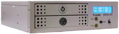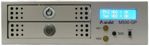 The ARAID M500 Disk Array automatically backs up system files and data in a disk drive to a second drive. In the event one of the drives fails, the other drive will take over operations and keep the computer running. The external bays and hot-swap support allow drives to be swapped out without dismantling or stopping the computer.